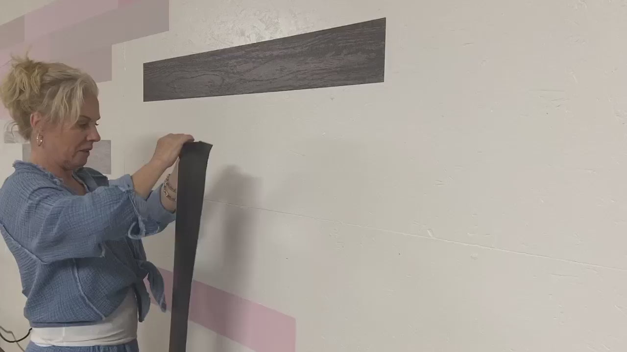 ELLE WALLS Peel and Stick Wallpaper tiles. Textured, Wood grained vinyl, 48 x 6 inch planks. Available in removable or a more permanent version.