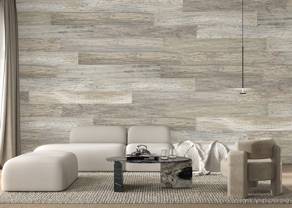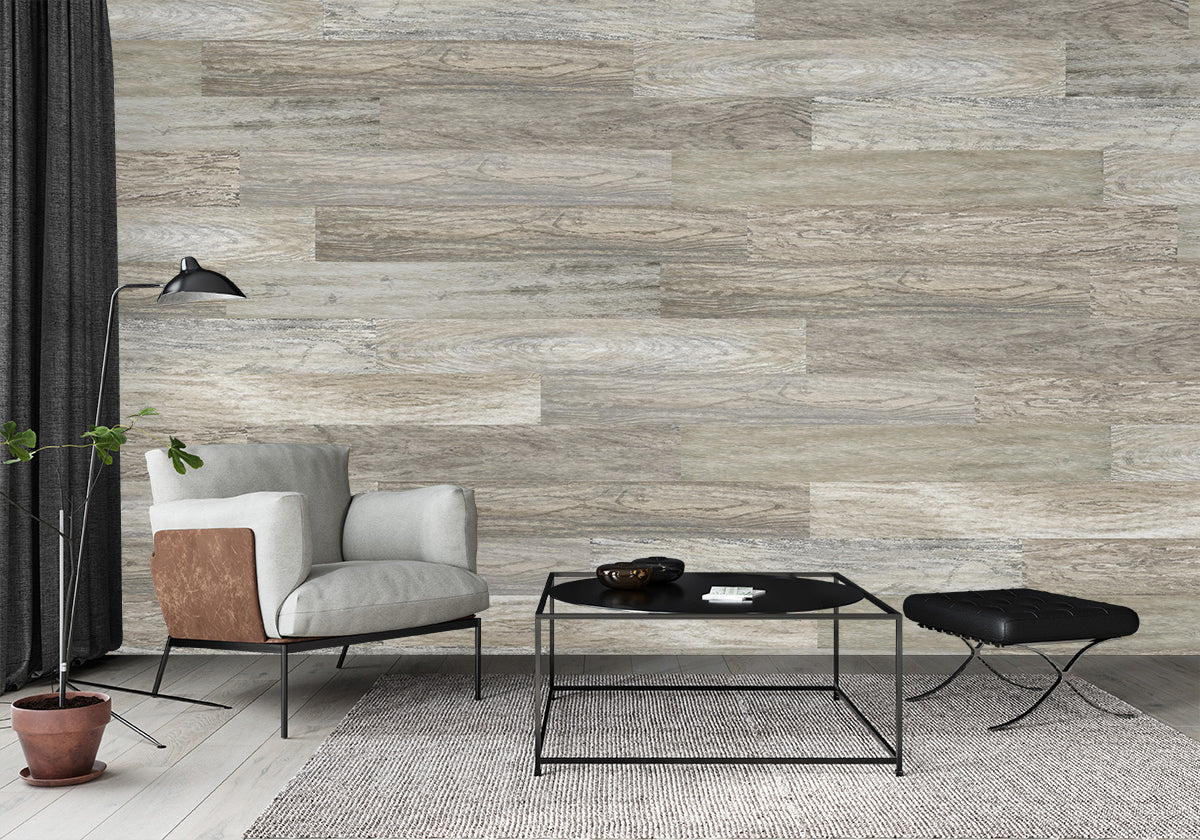 ELLE WALLS Peel and Stick Wallpaper tiles. Textured, Wood grained vinyl, 48 x 6 inch planks. Available in removable or a more permanent version.